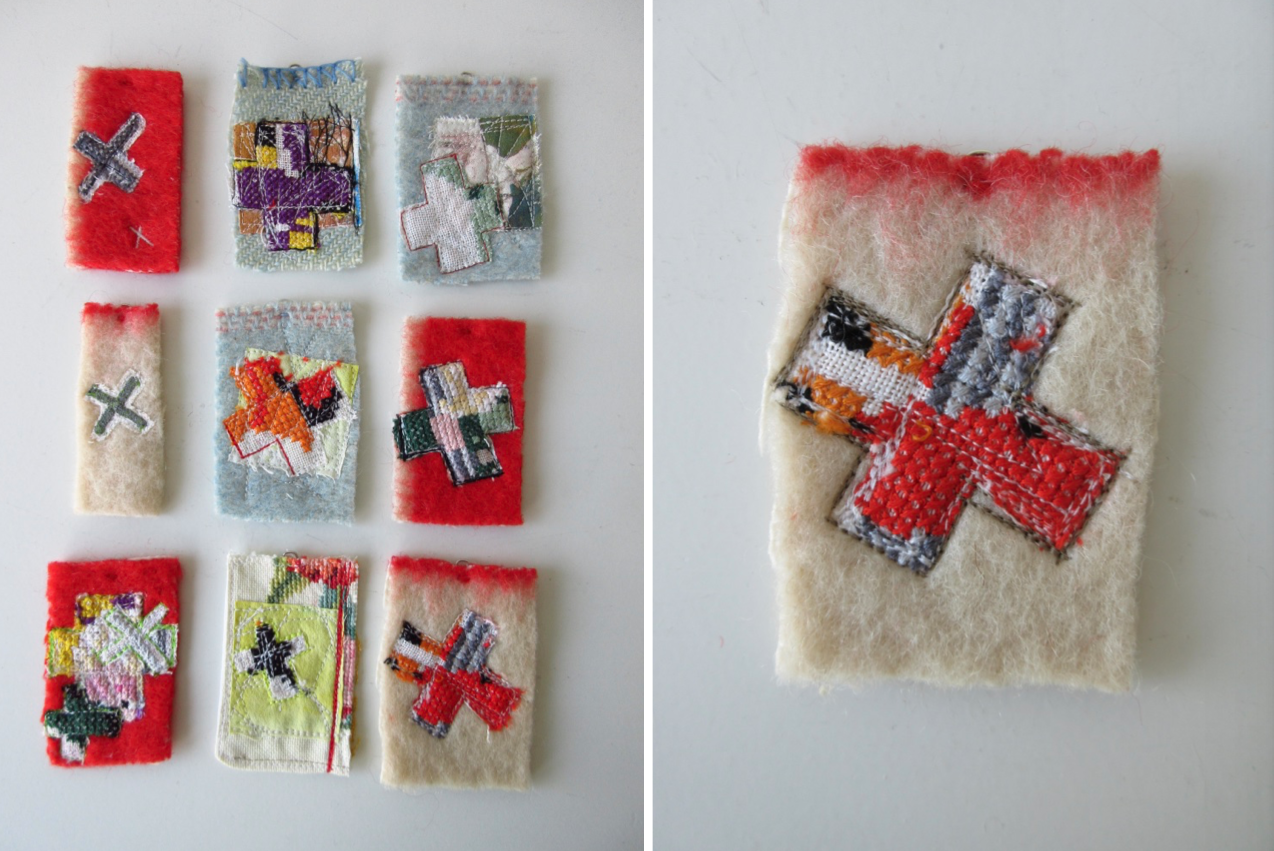 Deze textiel miniaturen gemaakt van gebruikt textiel met plusjes/kruisen voor Pakje Kunst gaan 14, 15 en 16 november in de automaat tijdens Textiel Plus festival.